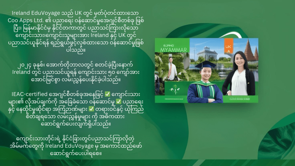 Ireland Edu Voyage is an education support service operated by Coo Apps Ltd., a UK-registered company, dedicated to helping international students—especially from Myanmar—pursues their academic dreams in Ireland and the UK.